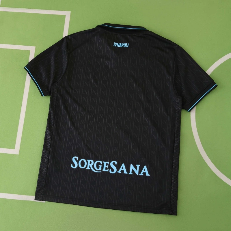 Il colletto a polo rifinito in azzurro dona un tocco vintage, mentre la scritta “SSC Napoli” sul retro completa un look di grande carattere.